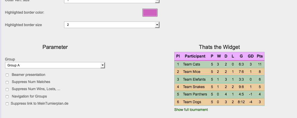 • Premium – Suppress link to MeinTurnierplan.de: Below the table there's a link Show full tournament. By clicking it users are directed to the presentation page on MeinTurnierplan.de. If this option is activated the link will be hidden. This is only available if you have a premium account.
